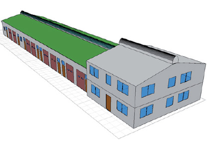 A development of 8 light workshop / commercial units with a double storey office block attached at the south end.