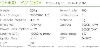 ZEF Tech E27 OP400 is 400 lumens for 6W input. Most competitive leading LED products (400 lumens) cost more and consume 33.3% more energy (8W input).